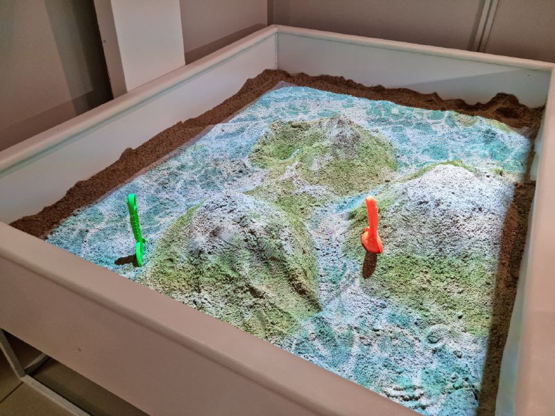 Интерактивная песочница — увлекательная среда, где дети превращаются в создателей волшебных миров с горами, озёрами и долинами прямо на песке. Система помогает малышам различать цвета и формы, стимулирует развитие воображения, формирует пространственное восприятие, улучшает память и внимательность малышей.