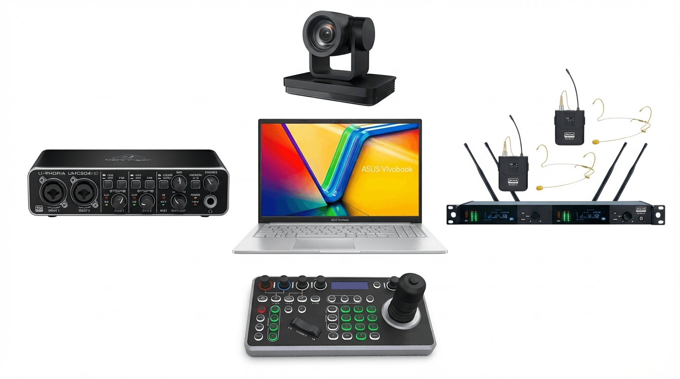 | Комплектация: | Ноутбук, внешняя звуковая карта, радиосистема c двумя поясными передатчиками и головными гарнитурами, PTZ камера, контроллер управления. |