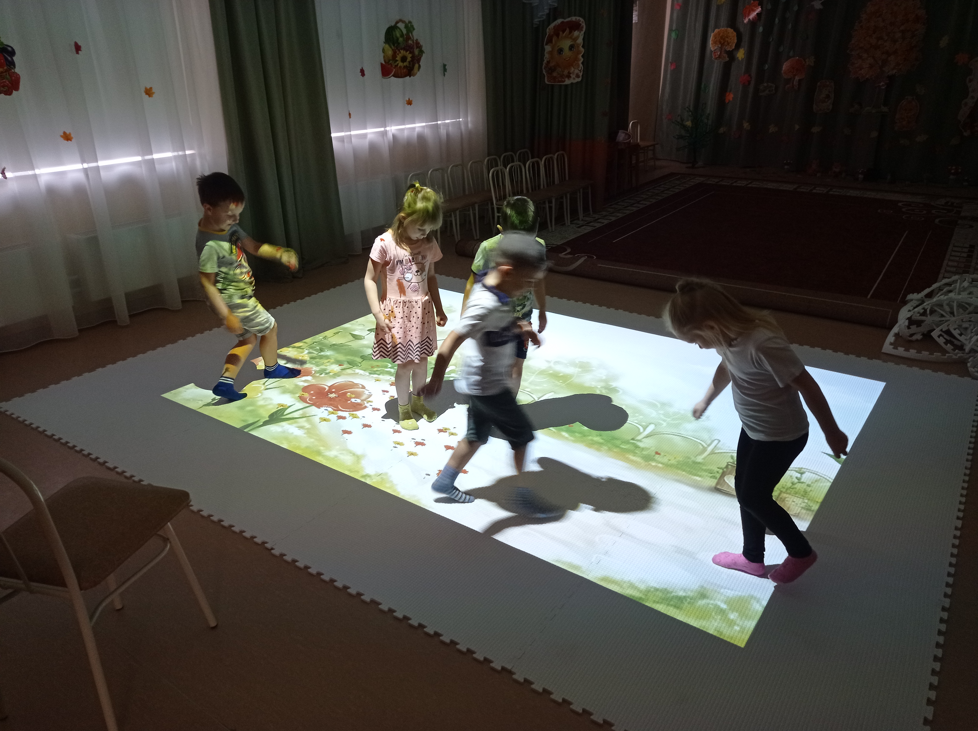 - Интерактивный пол создаёт дополненную реальность прямо на полу помещения. Он стимулирует развитие моторики и координацию движений у детей посредством увлекательных игр.