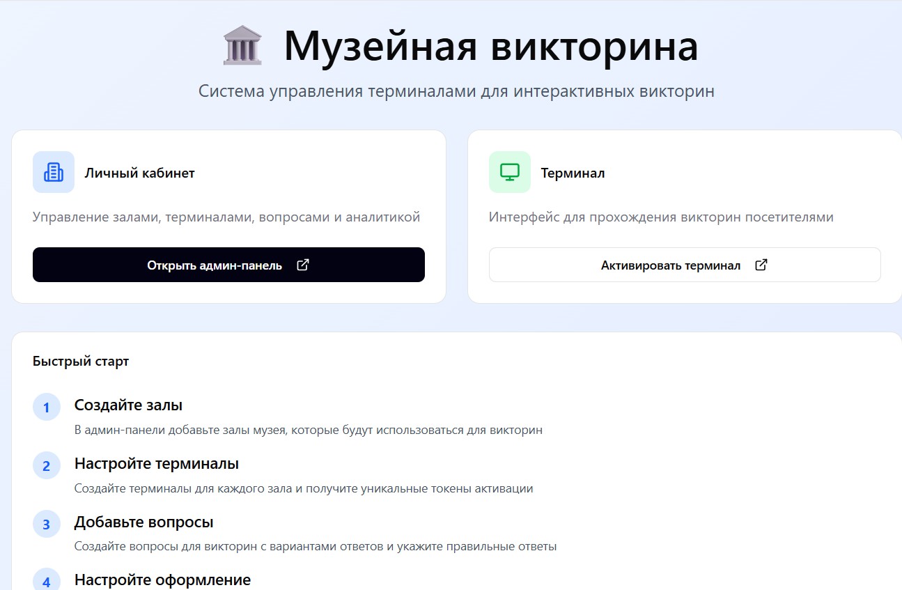 Система предназначена для проведения тематических викторин на интерактивных киосках в залах музея и для управления контентом викторин со стороны музея через веб‑кабинет.